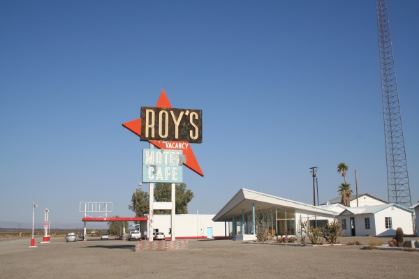 As you drove to Amboy Crater, along Route 66, you would have passed through Amboy, which is pretty much a ghost town. Its appearance probably hasn't changed much in the last 50 years, which makes it a great place to look around. A mining community in the 1880s, Amboy became noted, after Route 66 was built, as the site of Roy's Motel and Cafe, an iconic stop on the Mother Road. Since Interstate 40 drained the road's lifeblood of traffic, Roy's has operated sporadically. The entire town serves as a good photographic subject. It's an example of what building buffs call "Mid-Century Modern Googie Architecture," a style influenced by the futuristic dreams of the '50s.