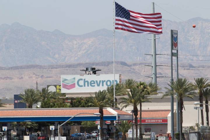 The giant American flags are clearly visible in Southern Nevada, off freeway exits, near neighborhoods and behind strip malls — a sign of patriotism for the oil company with which they’re affiliated.