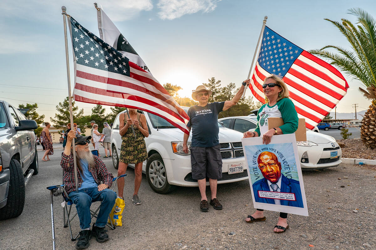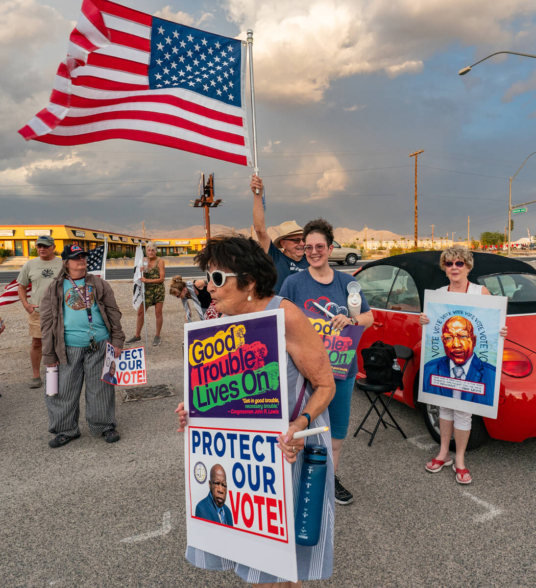 “The atmosphere was positive and reflective,” Okawa told the Pahrump Valley Times afterward. “We started the evening off with some people rallying on the sidewalks along Highway 160 and Basin Avenue with signs and flags, followed by a short speech from me in the parking lot, talking about how John Lewis spent his life fighting for civil rights and protecting the right to vote. Our right to vote is the cornerstone of a healthy democracy, it is not partisan – and now it’s our turn to carry the torch and continue his legacy.”