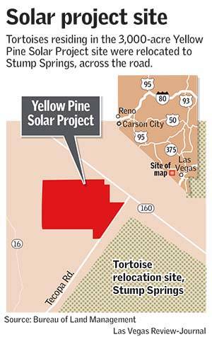 A team of biologists relocated 139 tortoises from their habitat to make way for the solar panels in the Yellow Pine Solar Project, one of four large solar energy developments initiated in Southern Nevada. The tortoises were moved across the road to Stump Springs in May.