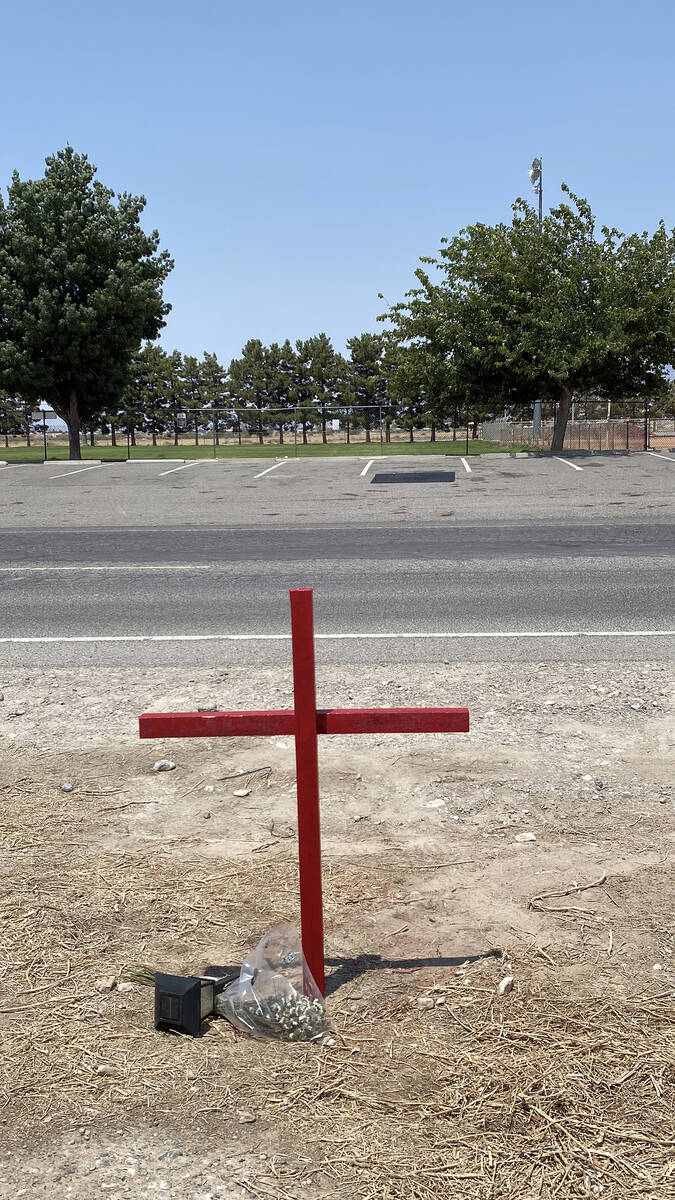 When visiting the site on Tuesday, July 15, the Pahrump Valley Times also saw a small bouquet of tiny white flowers and solar-powered walkway light to shine on the memorial throughout the night.