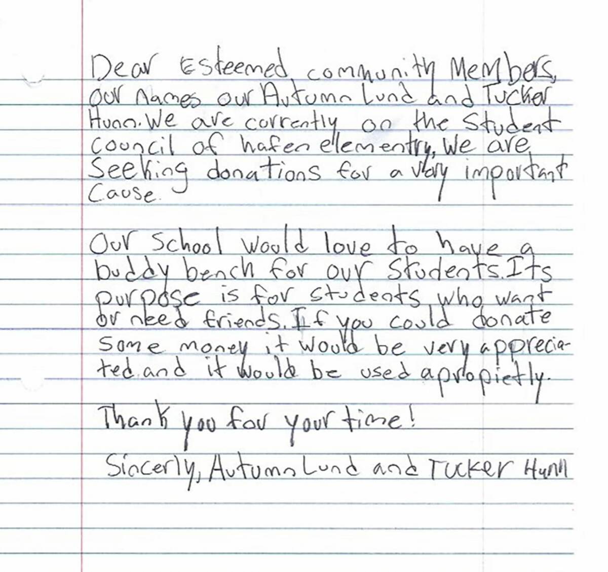 “Dear esteemed community members,” the letter penned by Autumn Lund and Tucker Hunn began. “We are currently on the student council of Hafen Elementary. We are seeking donations for a very important cause. Our school would love to have a Buddy Bench for our students. Its purpose is for students who want or need friends. If you could donate some money, it would be very appreciated and it would be used appropriately. Thank you for your time!”