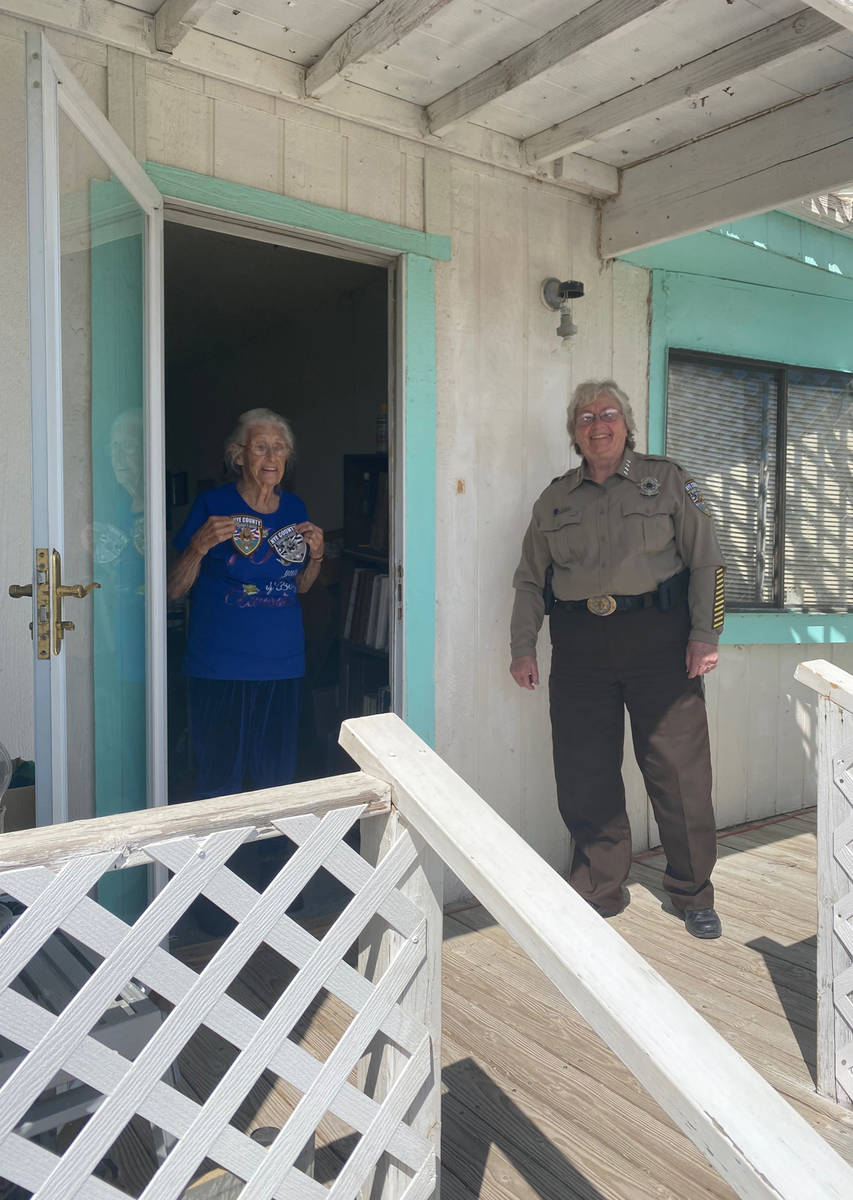 Nye County Sheriff Sharon Wehrly provided a special birthday greeting to Pahrump resident Roberta Jablonsky, who turned 100 years old on Tuesday, March 31. Jablonsky has lived in Pahrump since 1977. Due to the social distancing directive, friends and family provided a birthday cake and sang happy birthday from her driveway.