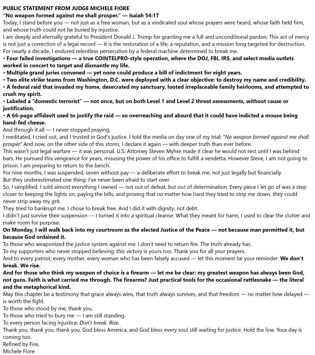Fiore cast the pardon in biblical terms. Her statement began with a phrase lifted from the book of Isaiah: “No weapon formed against me shall prosper” and said she would return to her position as a Pahrump justice of the peace.