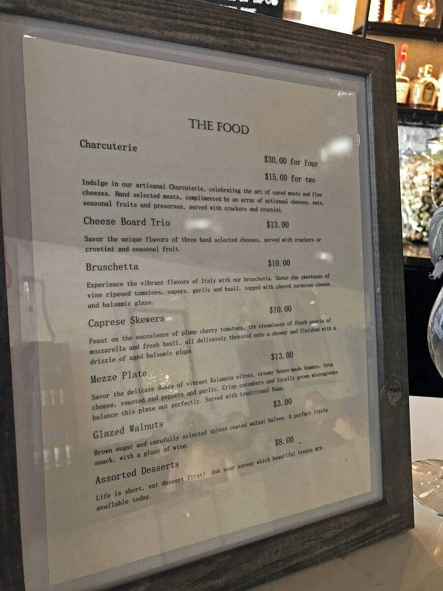 The Wine Down operates with a snack bar license, which restricts the food that can be served but Joelle and Keith both agreed that the menu they were able to develop is full of tempting delights, from cheese boards to bruschetta, charcuterie boards, desserts and more. As the winter months settle, The Wine Down will be branching into soup, too.
