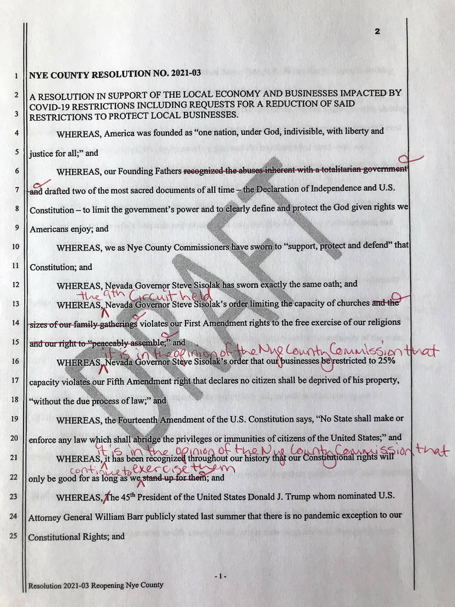 After making a multitude of changes to ensure the document would pass legal muster, the Nye County Commission unanimously approved a resolution emphasizing the struggles impacting its citizens in the face of the COVID-19 pandemic and requesting that Gov. Steve Sisolak remove his emergency mandates to allow all businesses to operate normally once more.