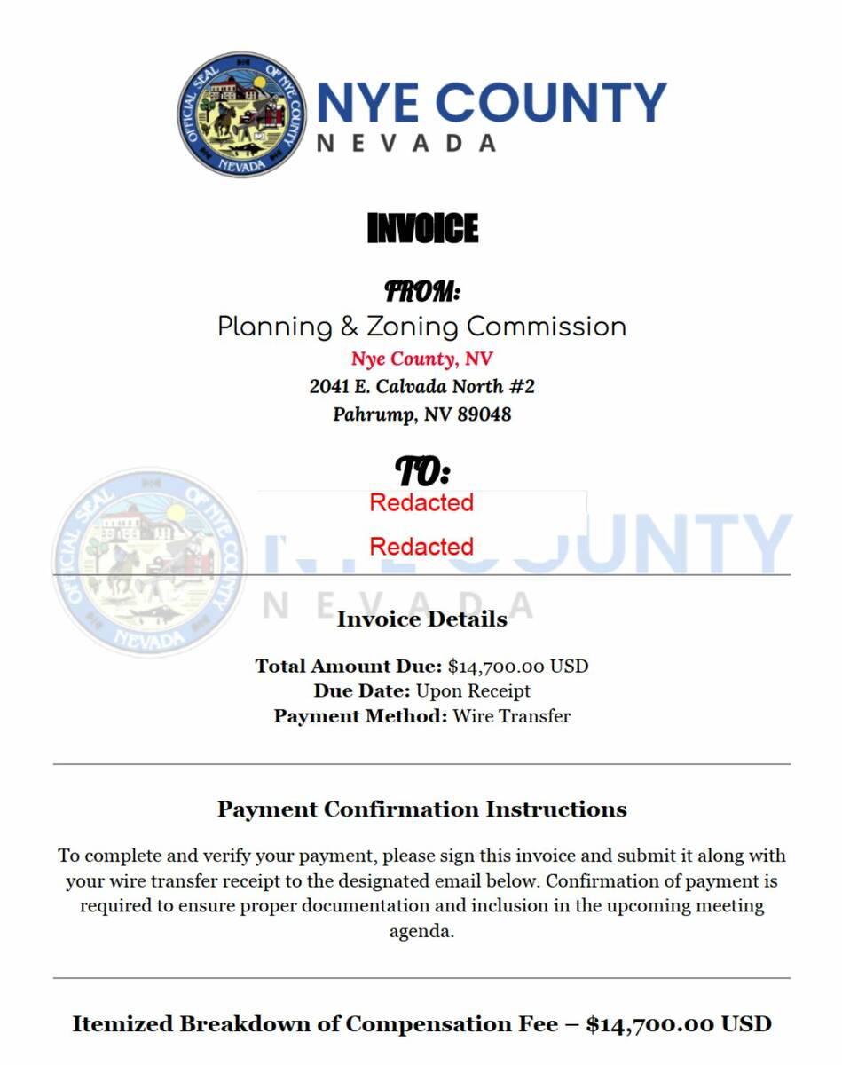 Osborne noted that the scammers are then getting an email address for the applicant of the project from the agenda where they then send a billing email to the applicant in an attempt to trick the person by using their actual information that they have on an agenda item to dupe the individual into believing it’s an actual bill from Nye County, and they are hoping that the applicant will simply respond and pay the fraudulent bill.”
