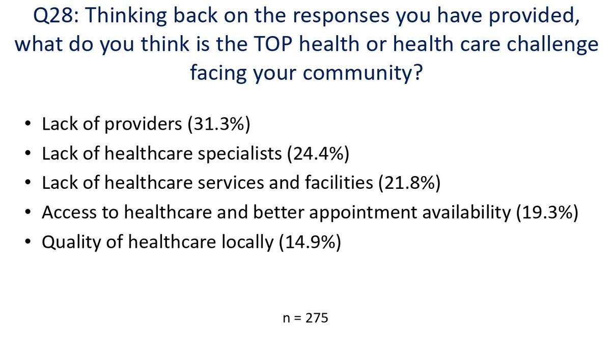The survey consisted of 29 questions on an array of topics that can affect health, such as medical care, housing and food insecurity. When it comes to the top three health needs faced by residents, access to health care, inadequate services for seniors and cost of health care, at a rate of 45.9%, 32% and 25.5%, respectively. Other top needs included transportation to health care and human services, mental illness and lack of affordable housing.
