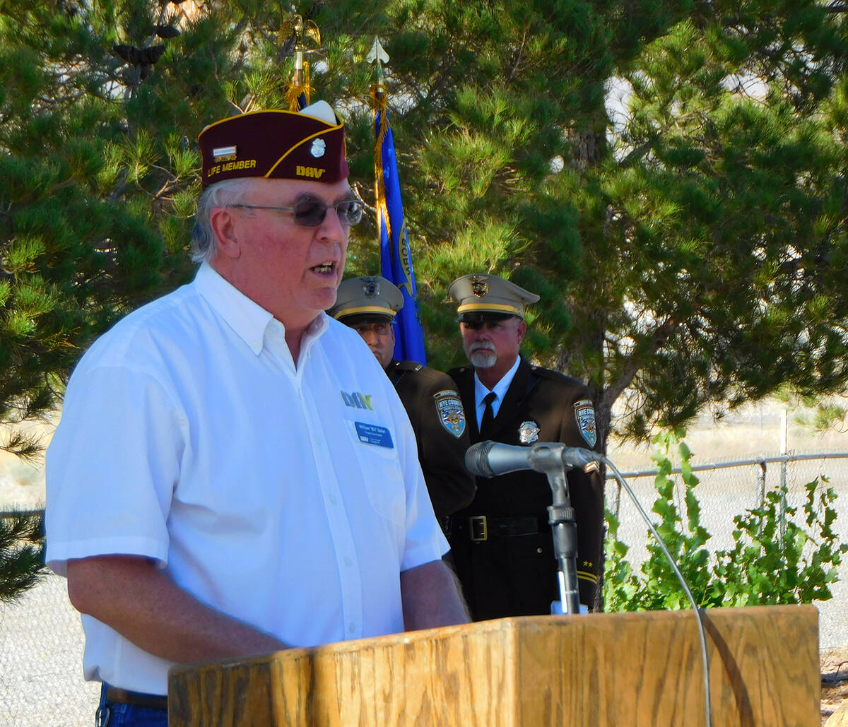 At 6 p.m. on Monday, May 30, DAV Chapter #15 Commander Bill Dolan welcomed those who had assembled at the Veterans Memorial inside the Chief Tecopa Cemetery for the solemn ceremony, taking a moment to recognize the local dignitaries and veterans’ organization leaders in attendance. Fellow DAV member Dr. Tom Waters then took over as master of ceremonies, inviting DAV Chaplain Leon Samuel to give the opening prayer.