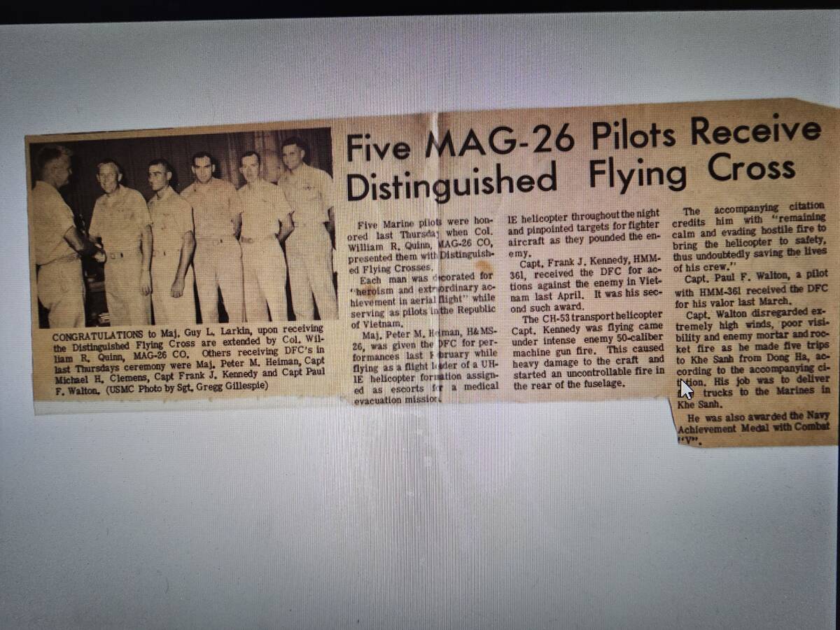 Walton was a member of HMM-361 who was awarded the Distinguished Flying Cross in March of 1968 for an operation flying through enemy-infested canyons to deliver trucks to the Marines at Khe San when that base was finally abandoned.