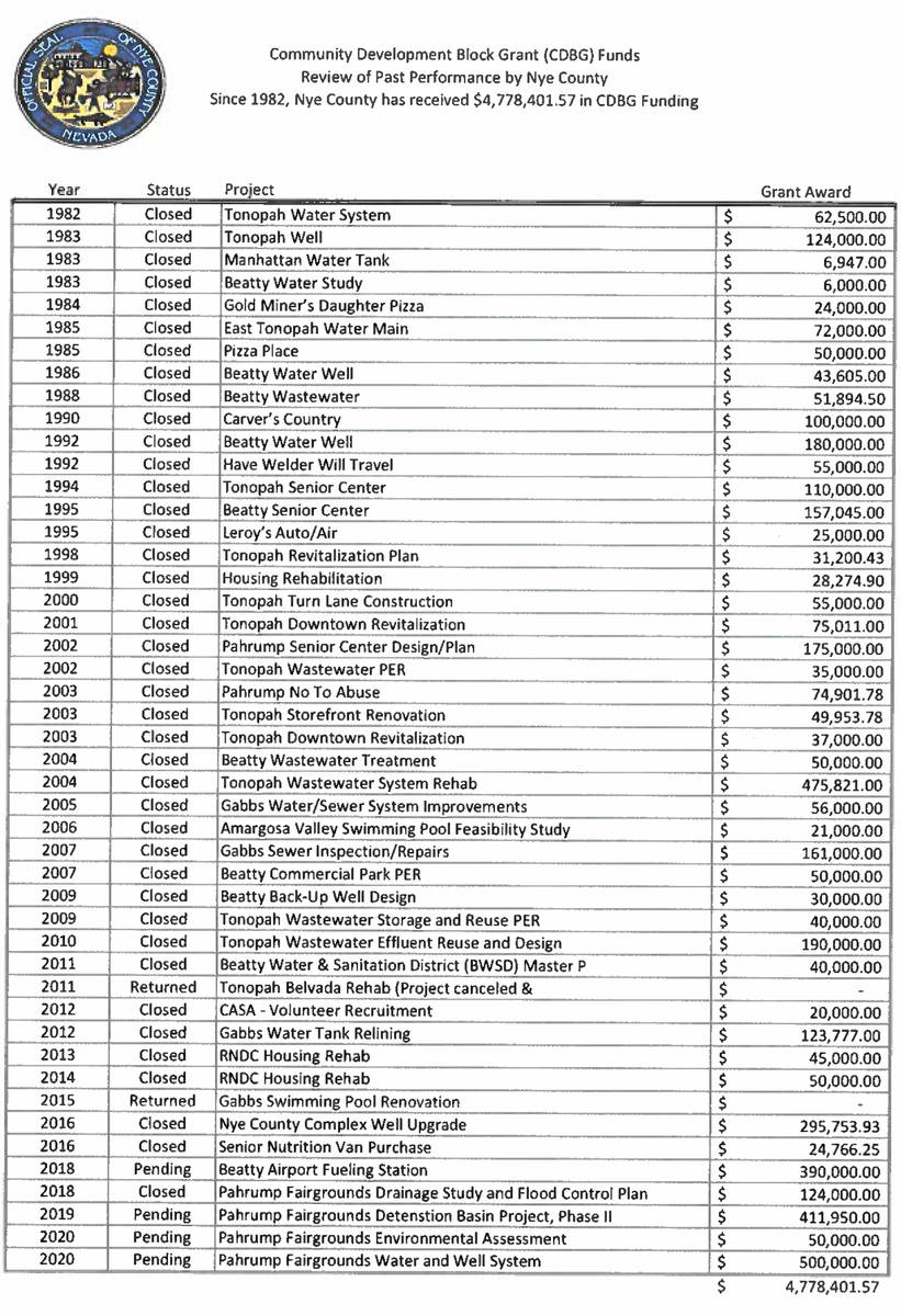 Nye County has benefited to the tune of more than $4.7 million since its first CDBG award in 1982, with all sorts of projects ushered along using the funds provided through the program. From a variety of water systems and studies to assistance for businesses and nonprofits to senior services, various renovation projects and much more, Nye County has put the CDBG funding to good use with an undoubtedly positive impact coming from each successful endeavor.
