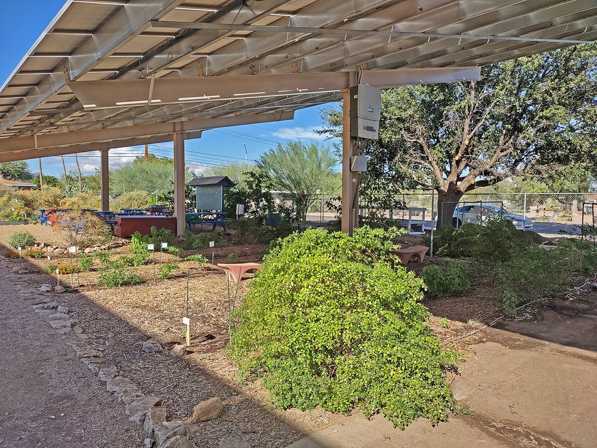 “This is one of the sites that, when I saw it, I thought, oh, Pahrump will love this,” Allen remarked of the elementary school solar garden. “It’s a partnership between the school district, the community, the university and its cooperative extension. It incorporates elevated solar panels – they look a lot like carports – and underneath they grow a variety of native species, some that are culturally important species. And the power that they generate goes to offset the school’s utilities usage, so it helps to reduce their utility bills.”
