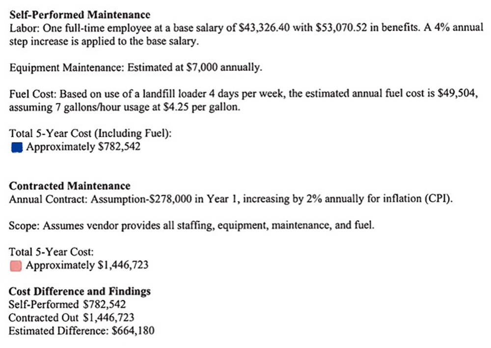 Initially, Bolling had reached out to an alternative contractor but with no interest shown by that company, he turned to the in-county operation method. Comparing the two, Bolling reported that a contract with the alternative provider would run somewhere around $1.44 million over the course of five years. A county employee, plus a new loader and fuel costs, would come to just $782,542 in five years, a difference of more than $664,000.