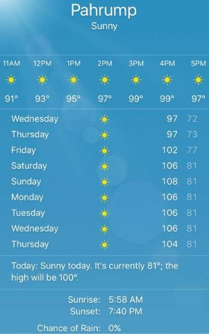 Tuesday there will be sunny skies, with a high near 100 degrees. Wind will blow from the east-southeast 10 mph to 17 mph, becoming south in the afternoon, according to the National Weather Service. Winds could gust as high as 24 mph.