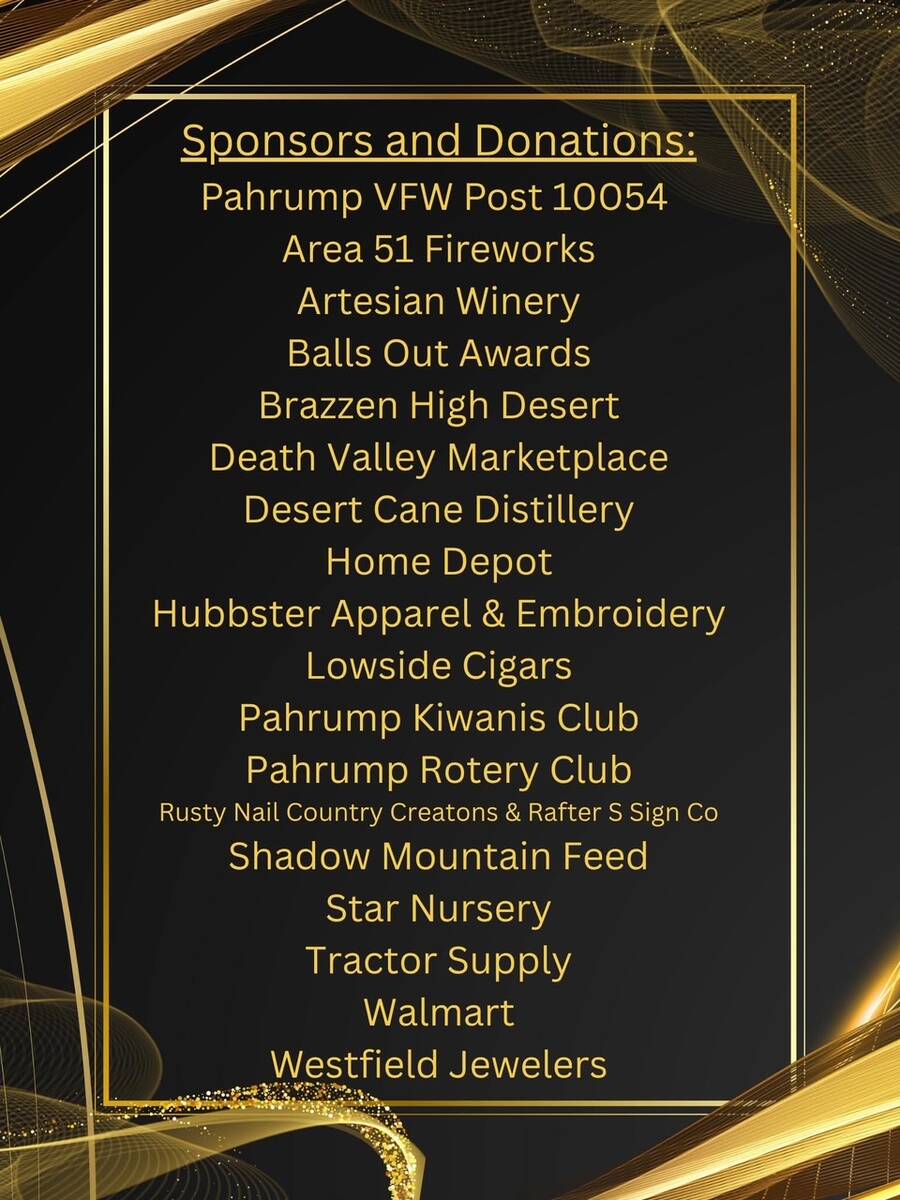 Sponsorships for the BBQ brisket fundraiser include: Pahrump VFW Post 10054, Area 51 Fireworks, Artesian Cellars Winery, Balls Out Awards, Home Depot, Lowside Cigars, Death Valley Marketplace, Desert Cane Distillery, Brazzen High Desert, Hubbster Apparel & Embroidery, Pahrump Kiwanis Club, Pahrump Rotary Club, Rusty Nail Country Creations & Rafter S Sign Co, Jam Rafter Signs, Shadow Mountain Feed, Star Nursery, Tractor Supply, Walmart and Westfield Jewelers.