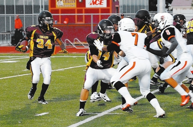 Senior Trojans fullback Scott Maughan was responsible for 120 yards, nearly half the Pahrump offense, which was 246 yards total. He scored two of three touchdowns for the Trojans. He was like a machine, tearing up the middle of the field with five-to-six-yard bursts at a time.