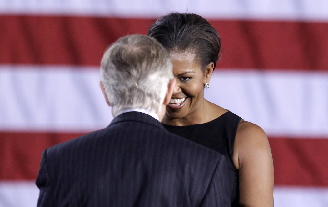First lady Michelle Obama hugs U.S. Sen. Harry Reid, D-Nev., at Canyon Springs High School in N ...